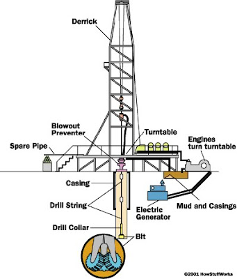 · Derrick - support structure that holds the drilling apparatus; tall enough to allow new sections of drill pipe to be added to the drilling apparatus as drilling progresses